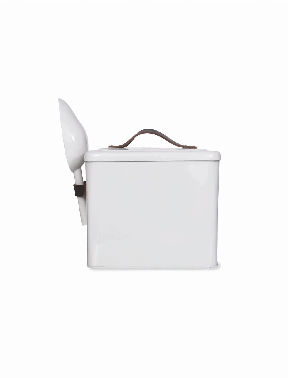 Avec sa base en acier poudré dans une très belle couleur neutre écru, et un couvercle , elle est livré avec une pelle en acier galvanisé et est fini d’une poignée en métal.