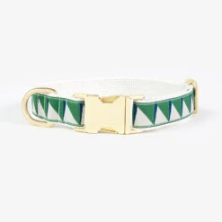 Fabriqué à partir d’une sangle de chanvre à séchage rapide, ils sont décorés d’un tissus à motifs géométriques très graphiques et possède une boucle de sécurité et une clochette.
