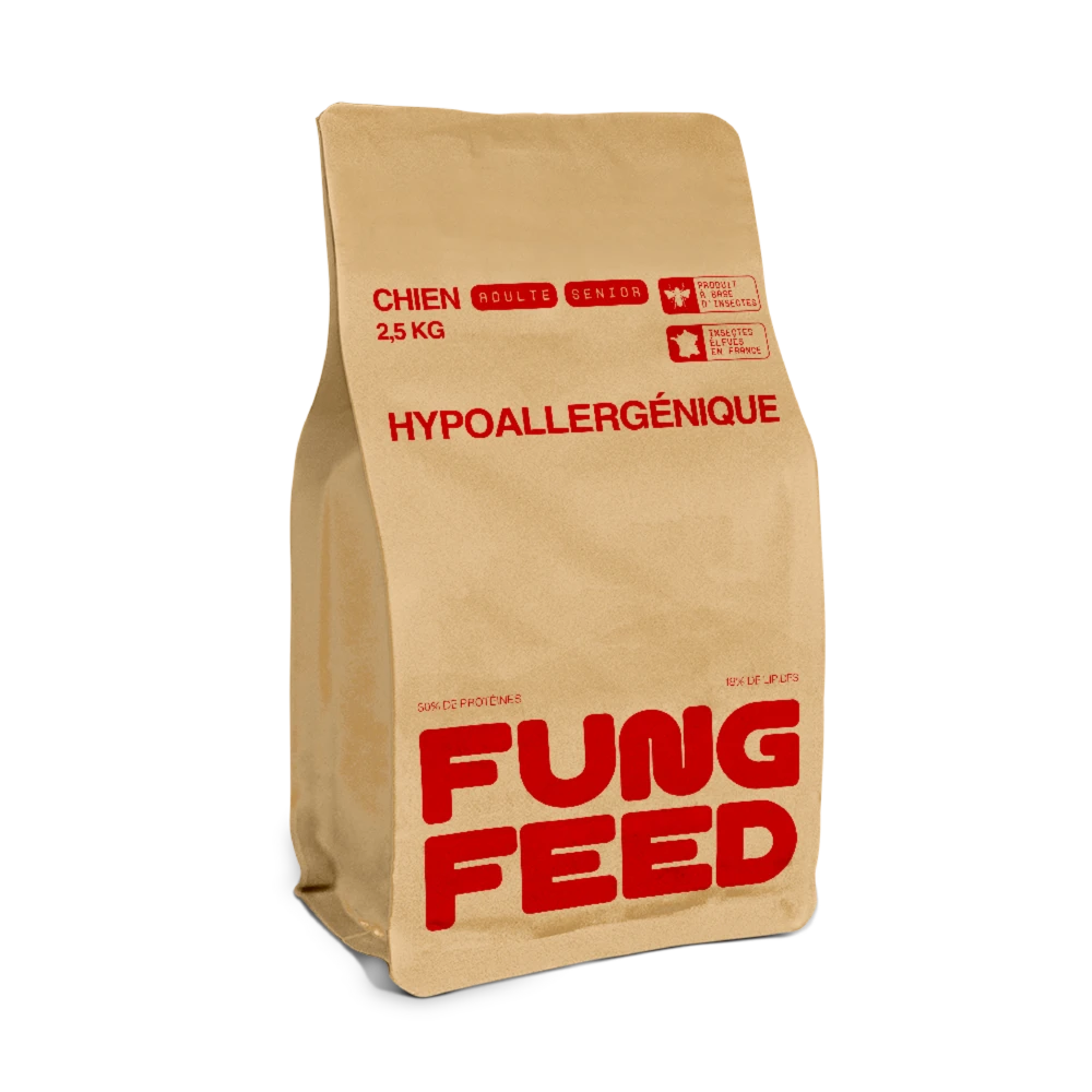 Les croquettes pour chien à base d’insectes de Fungfeed sont hypoallergéniques, écologiques et made in France. Elles conviennent aux chiens de tous âges et de toutes races.