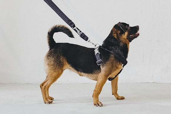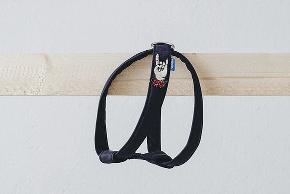 Harnais bleu marine pour chien en forme de huit en polyester recyclé. Il est imperméable et très resistant.