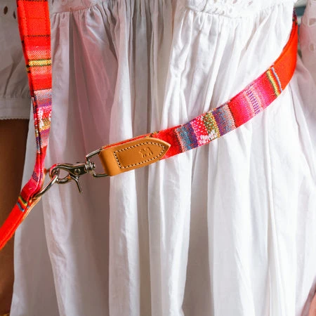 Ces laisses pour chien uniques sont faites à la main couvertures douces de style Inca tissées en Bolivie. Tissu rose vif avec des pointes de bleu, rouge et vert avec une dominante orange, les attaches sont faites de cuir.