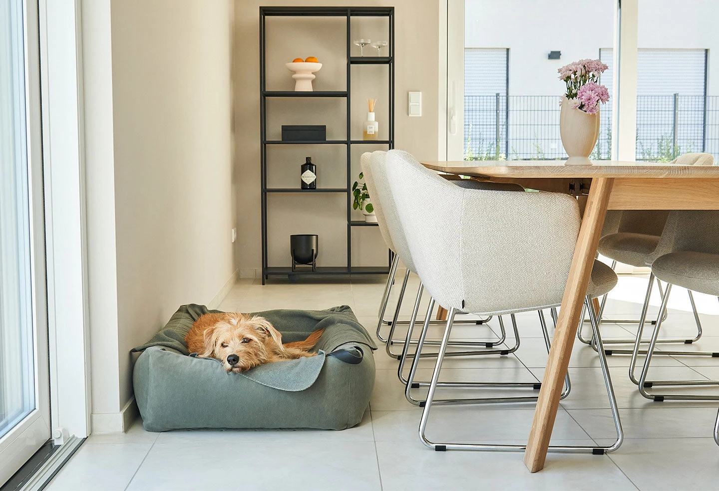 Le lit pour chien Velluto est proposé dans différents coloris modernes et délicats pour une intégration dans n’importe quel lieu de vie.