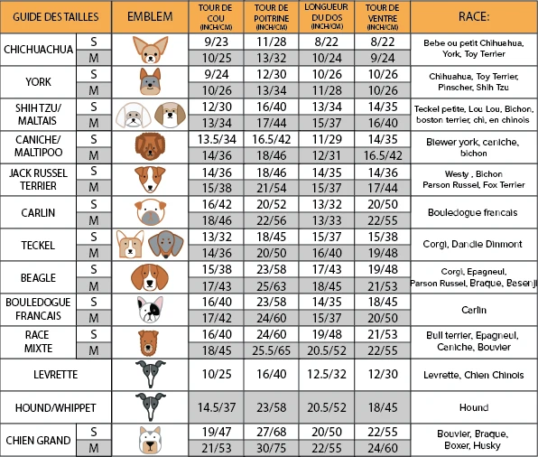 - Disponible en différentes tailles : Chihuahua S, Yorkshire Terrier S, Yorkshire Terrier M, Shih-Tzu S, Shih-Tzu M, Jack Russell Terrier S, Jack Russell Terrier M, Teckel S, Teckel M, Bouledogue français M.